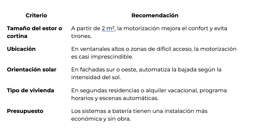Elegir la motorización correcta depende de varios factores, desde el tipo de ventana a la orientación, el tamaño del tejido y el uso que se le va a dar. Aquí te dejamos algunos criterios clave para decidir: