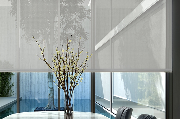 Este modelo, disponible también en un amplio abanico de texturas y colores, permite combinar un tejido decorativo y un tejido técnico en el mismo sistema de cortina, lo que garantiza aunar la gestión completa de la luz con la máxima modernidad. En el caso de las enrollables con cajón interior (box), el rollo del tejido y su mecanismo se integran totalmente con el espacio, quedando elegantemente ocultos y aportando distinción.