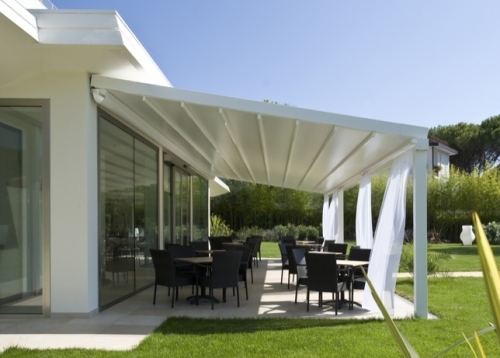 - Pérgolas con sistema enrollable motorizado: Crea una estructura limpia a cielo abierto, que puede cubrirse en apenas pocos segundos para protegerse de los efectos del sol.