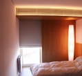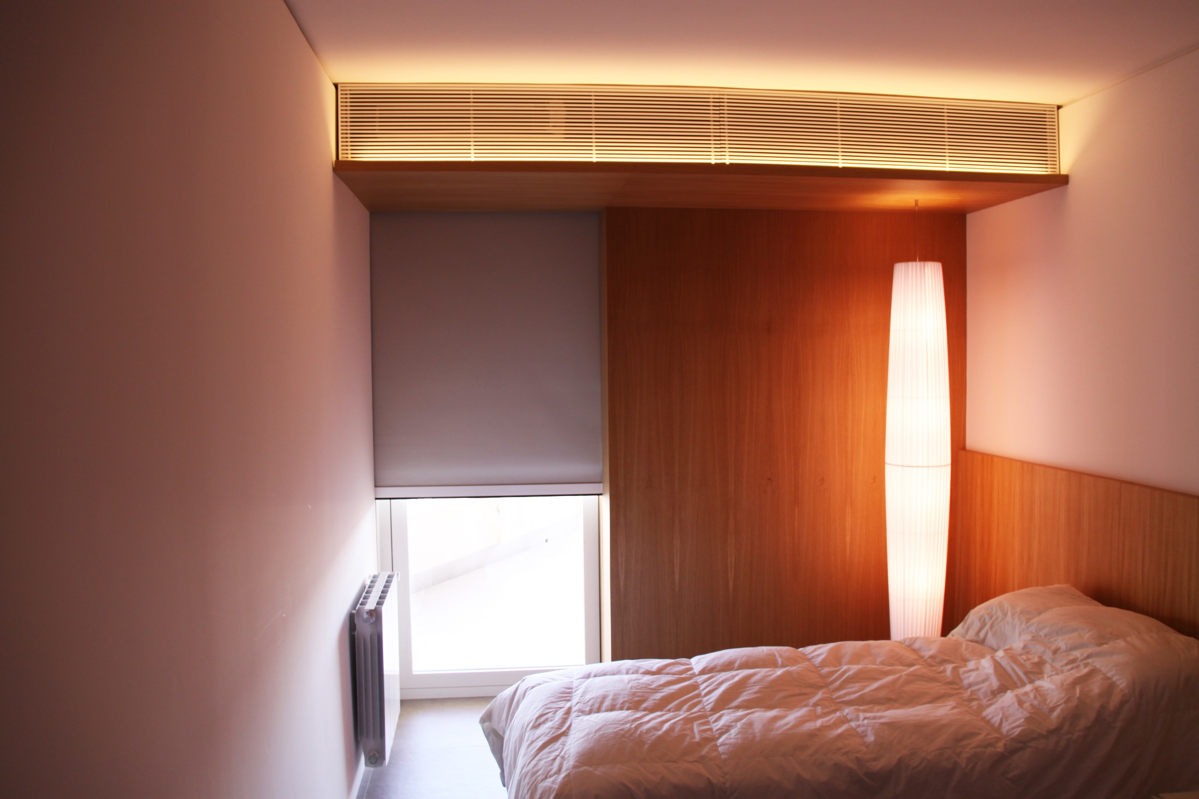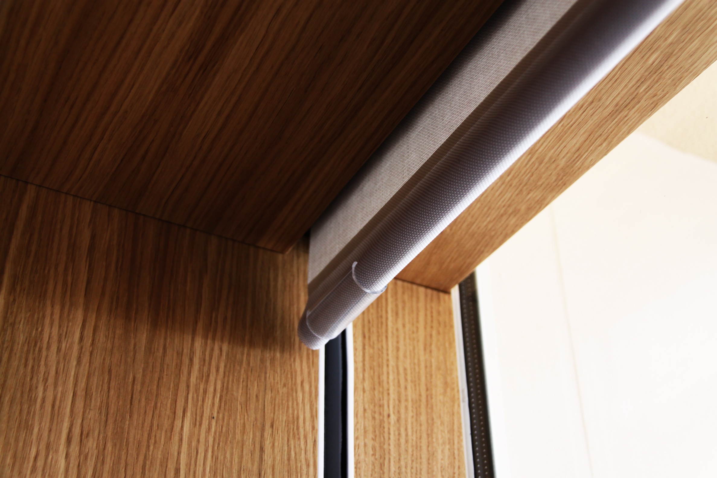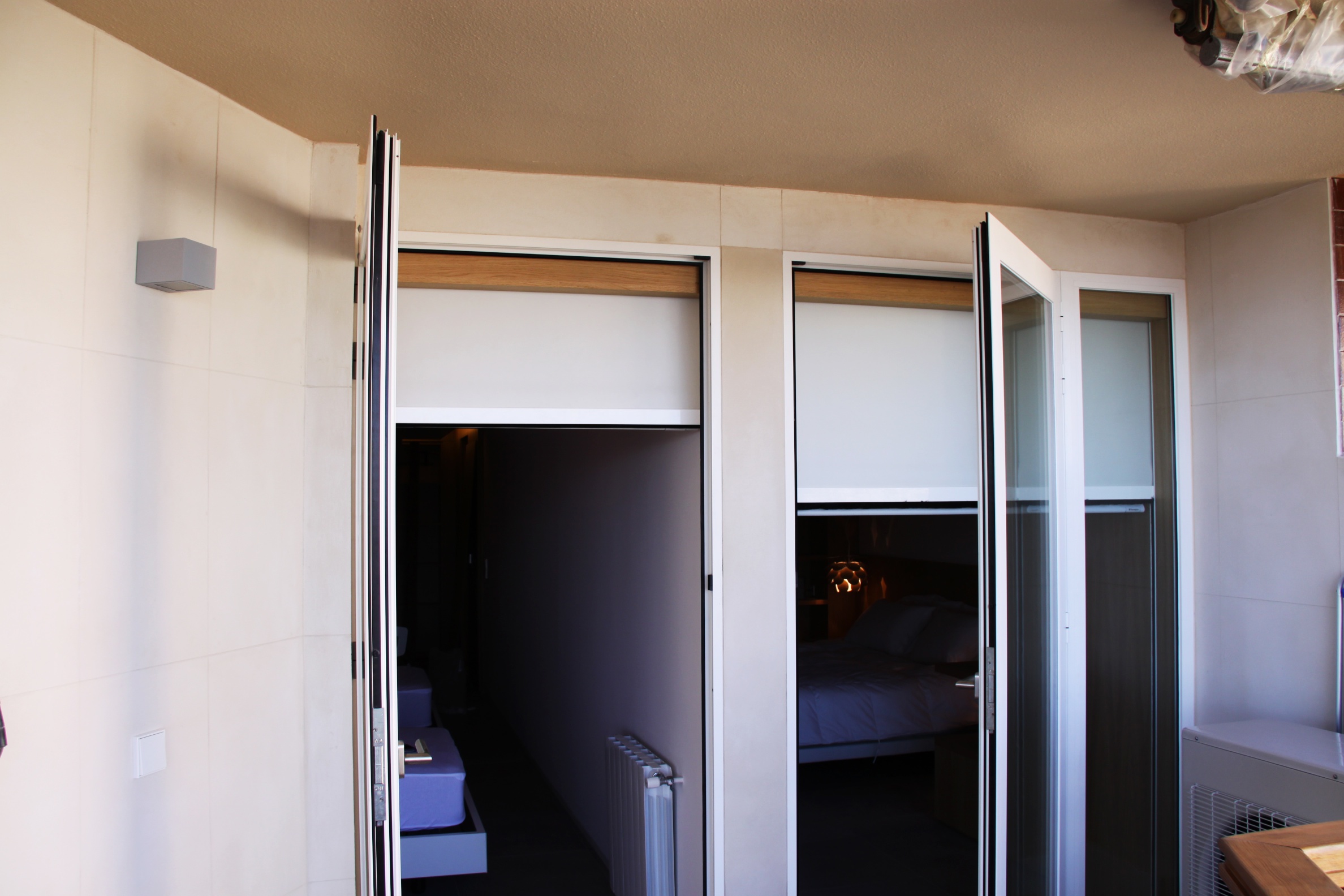 Para las habitaciones, y dado que en ellas se solicitaba un oscurecimiento total para las horas de sueño, nuestro equipo optó por el sistema de enrollable con cajón Box y guías de Bandalux así como por un tejido black out que proporciona una oscuridad al cien por cien.