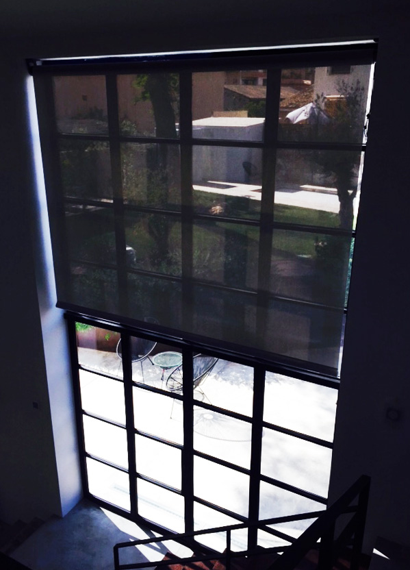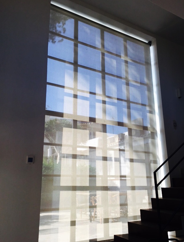 El reto al colocar las enrollables interiores Bandalux era proteger del sol un gran ventanal sin bloquear la visibilidad del exterior. Dadas las grandes dimensiones del ventanal así como su elevada altura, decidimos emplear nuestro sistema ARION, especial para grandes dimensiones. El tejido elegido fue el Polyscreen Bandalux con una apertura del 5%, todo en tonos crudos para que que combina con el diseño interior de la vivienda.